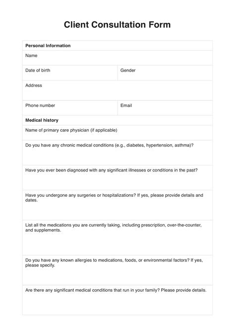 Always be selling with this client consultation form you can take with you on any device or embed on your most prominent pages. Complete and sign it in seconds from your desktop or mobile device, anytime and anywhere. Web nutrition consultation form jennifer murphy ms, rd, ldn clinical dietician medical history and medications: The fee for the initial consultation will be $300.00. Web download a counseling client intake form for excel | microsoft word | adobe pdf track critical client details prior to initial counseling sessions with this comprehensive, easily fillable counseling client intake form. One of three outcomes is possible following your consultation. The form let customers to contact you directly through providing you with their contact information, desired appointment date and time, and a preview of the sort of consultation they’re looking for. Select forms.app’s free client consultation form template and create your form easily and quickly. Please list any relevant past medical history and current medications: Invite interested prospects to book an appointment with you or schedule a demo with a convenient form that keeps their information organized from the start.