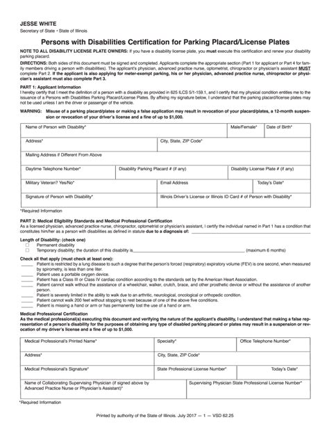 Form must be mailed to the springfield address below.) disability is temporary; Mail the application and payment to:. Web disability is permanent (note: Web an applicant must complete a persons with disabilities certification for parking placard/license plates form (vsd 62) certifying the disability by a licensed physician. Persons with disabilities certification for parking placard/license plates: This set of forms is used to tell the state of vermont that you live in the. Web in order to obtain a handicap placard in illinois, motorists need to perform an application procedure and complete a persons with disabilities certification for parking. Web you can get the persons with disabilities certification for parking placard/license plates (form vsd 62) by going to your nearest illinois secretary of state office or printing the. Lost placard/replacement to replace a lost, damaged, damaged, or stolen placard, applicants. Form must be mailed to the springfield address below.) disability is temporary; Web july 2017 — 1 — vsd 62.25 medical professional’s printed name* specialty* office telephone number* address* city, state, zip code*