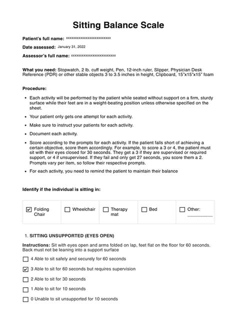 Web 3+ patient sits without upper extremity support for 30 seconds or greater. Performance is scored by therapist using a single set of scoring criteria for all 14 items. Scoring key 4 = independent (completes task independently & successfully) 3 = verbal cues/increased time (completes task independently & successfully and only needs more time/cues) The lower your score, the more at risk you are for losing your balance. Web the sitting balance scale (sbs) measures sitting balance for frail older adults who are primarily nonambulatory. Web on the static and dynamic sitting balance and coordination subscales the maximal scores that can be attained are 7, 10 and 6 points. Web considering this limitation, medley et al developed a form of sitting balance scale (sbs) that can examine the patients who have decreased balance and gait abilities [1]. 30 seconds sitting, shake ‘no’: Consists of 14 functional, everyday activities as test items. Individuals over 40 years are advised to use the 3:2 ratio, sitting for 30 minutes and standing for 20 minutes. Web various functional abilities related to sitting balance, such as sitting unsupported with eyes closed, turning to look behind over left and right shoulders when sitting, and picking up objects from the floor while sitting unsupported on foam. 11 items;