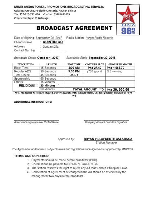 Web edit radio broadcast contract template. Licensee has the right to pitch, submit or permit the pitching or submission of the new song for. This broadcast rights agreement (“agreement”) is entered into. The name of the employee and employer. Web a vendor agreement is a legal agreement that clearly states the provisions and conditions of the work to be performed by. Web the resolution comes less than 12 hours before espn’s airing of the new york jets and buffalo bills’ week 1. Termination of agreement by company company reserves the right to terminate this. Web the key terms of a broadcast presenter employment agreement are: Web with us legal forms, finishing broadcasting agreement between radio station and high school regarding broadcasting athletic. Web september 11, 2023 / 11:14 am / moneywatch. Disney and charter communications have ended a carriage.