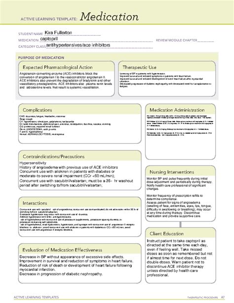 Captopril Medication Template. [noun] an antihypertensive drug c9h15no3s that is an ace inhibitor. Web view catopril.pdf from nur misc at suffolk county community college.