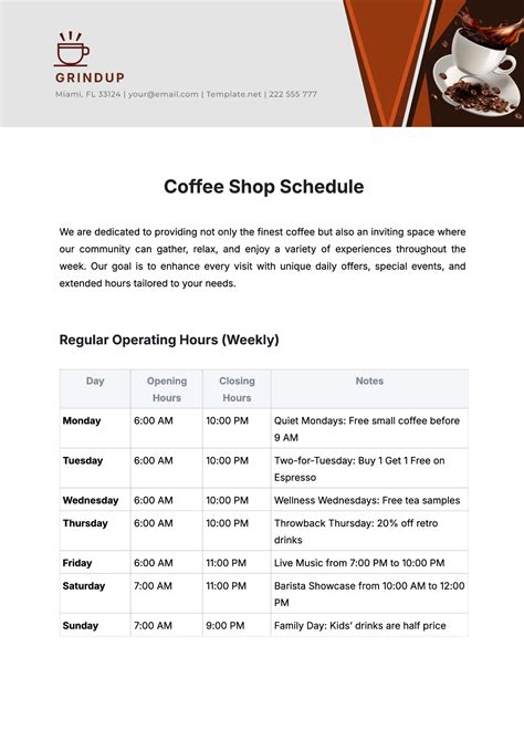 Coffee Shop Schedule Template. The operations plan for java bros is relatively simple as its overhead and cost is small. Web *valid 9/7, 9/14, 9/21, and 9/28/23 after 12:00 p.m.