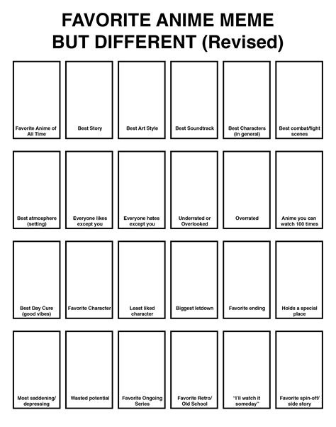 I honestly still don't know what my preference is. Web anime/manga/character/game 3x3 online generator. Web browse our free templates for anime designs you can easily customize and share. I honestly still don't know what my preference is. Character version of the favorite anime but different template template best used by making. Youtuber red bard made a twitter post that included a blank template for others to. Take a look through our anime templates collection and discover our amazing, easy to use digital design. Yellow cute funny doge discord profile picture avatar template. Web anime favorites meme. 19 anime where do you create this? I recommend the manga, it has way better pacing, the anime is very slow.