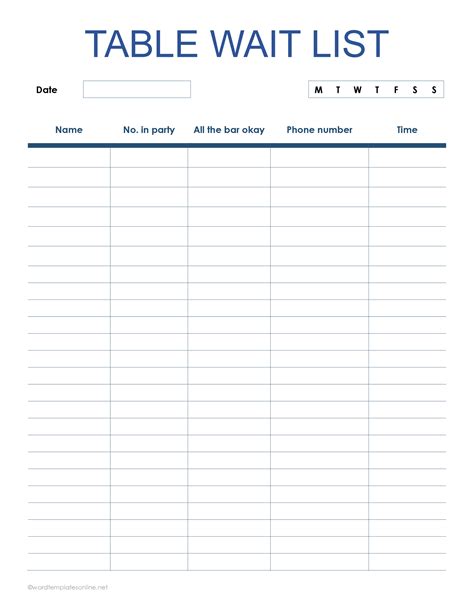 Still prefer the pen and paper way? Web with this free template, we've created a waitlist template for you to simply print out and fill in as guests enter your restaurant. Fill out our free, printable waitlist template. Still prefer the pen and paper way? Web this restaurant waiting list form is a form that will help any small restaurants to manage their waiting list visitors. Web when you download our free, printable restaurant waitlist template, you’ll get a pdf of a chart that has a place to record the date and day of the week, and columns for each. Web set up a waitwhile virtual waitlist in minutes to let customers wait their turn using any device. It is needed to prevent any disputes between. This restaurant waitlist template includes.