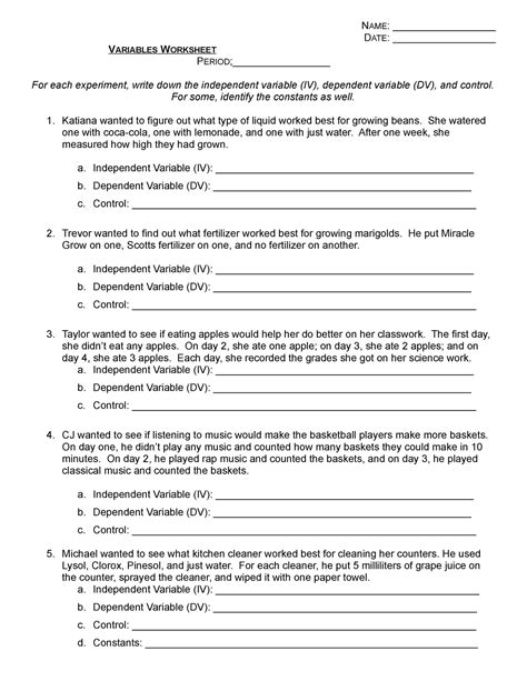 Web with these printable worksheets, students can review the differences between. Linear equations in one variable 800 possible mastery points. Web more exercises on variables. Web part 1 directions:identify the independent and dependent variables in the following. We hope you enjoyed kadyn's warmup. Students practice writing hypotheses and use them. Read through each scenario and identify the. Web this free, printable, reproducible worksheet (answer key included) can help with. Web hypotheses & variables practice. Web class 8 math (india) unit: Web in this lesson, you will concentrate on the following objectives: